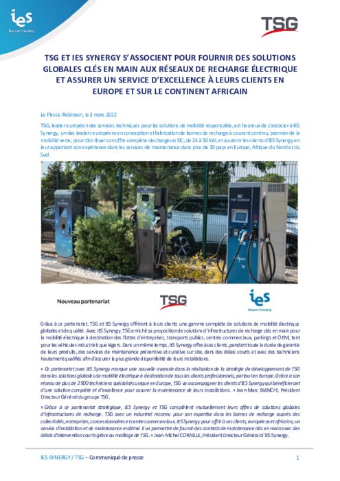TSG, leader européen des services techniques pour les solutions de mobilité responsable, est heureux de s'associer à IES Synergy, un des leaders européens en conception et fabrication de bornes de recharge à courant continu, pionnier de la mobilité verte, pour distribuer son offre complète de chargeurs DC, de 24 à 50 kW, et soutenir les clients d'IES Synergy en leur apportant son expérience dans les services de maintenance dans plus de 30 pays en Europe, Afrique du Nord et du Sud.
