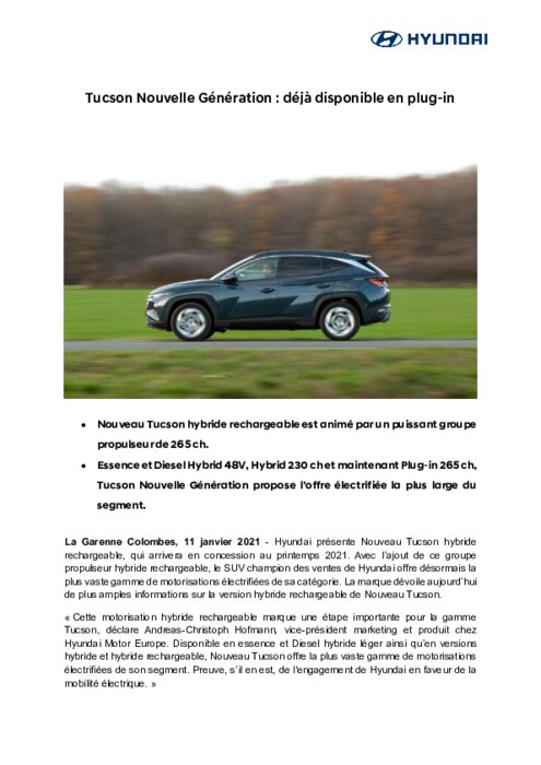 Hyundai présente Nouveau Tucson hybride rechargeable, qui arrivera en concession au printemps 2021. Avec l’ajout de ce groupe propulseur hybride rechargeable, le SUV champion des ventes de Hyundai offre désormais la plus vaste gamme de motorisations électrifiées de sa catégorie. La marque dévoile aujourd’hui de plus amples informations sur la version hybride rechargeable de Nouveau Tucson.
