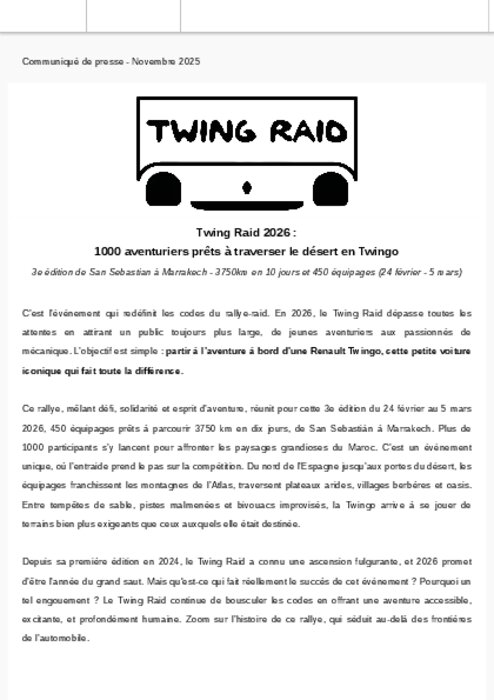 C’est l’événement qui redéfinit les codes du rallye-raid. En 2026, le Twing Raid dépasse toutes les attentes en attirant un public toujours plus large, de jeunes aventuriers aux passionnés de mécanique. L’objectif est simple : partir à l’aventure à bord d’une Renault Twingo, cette petite voiture iconique qui fait toute la différence.