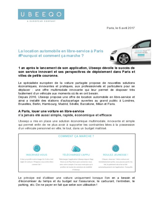 1 an après le lancement de son application, Ubeeqo dévoile le succès de son service innovant et ses perspectives de déploiement dans Paris et villes de petite couronne. Le spécialiste européen de la voiture partagée propose de nouvelles solutions économiques, innovantes et pratiques, aux professionnels et particuliers pour se déplacer : une offre multimodale innovante qui leur permet de disposer très facilement d’un véhicule aux moments où ils en ont besoin.