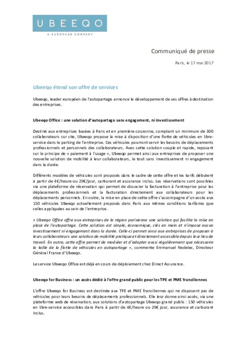 Destiné aux entreprises basées à Paris et en 1ère couronne, comptant un minimum de 300 collaborateurs sur site, Ubeeqo propose la mise à disposition d'une flotte de véhicules en libre-service dans le parking de l'entreprise. Ces véhicules pourront servir les besoins de déplacements professionnels et personnels des collaborateurs. Avec cette solution souple et rapide, reposant sur le principe de "paiement à l'usage", Ubeeqo permet ainsi aux entreprises de proposer une nouvelle offre de mobilité.