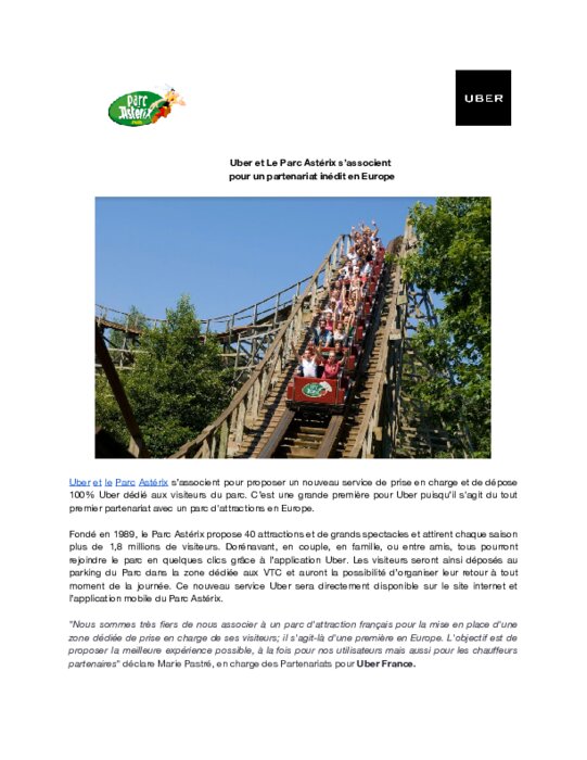 Uber et le Parc Astérix s’associent pour proposer un nouveau service de prise en charge et de dépose 100% Uber dédié aux visiteurs du parc. C’est une grande première pour Uber puisqu’il s'agit du tout premier partenariat avec un parc d'attractions en Europe.