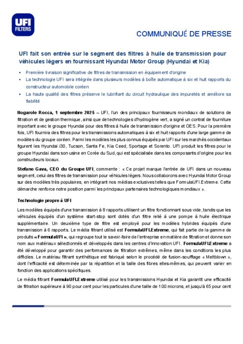 UFI, l'un des principaux fournisseurs mondiaux de solutions de filtration et de gestion thermique, ainsi que de technologies d'hydrogène vert, a signé un contrat de fourniture important avec le groupe Hyundai pour des filtres à huile de transmission d'origine et OES.