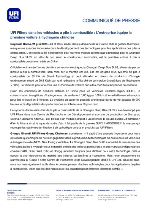 UFI Filters, leader dans le domaine de la filtration et de la gestion thermique, marque une avancée importante dans le développement des technologies pour les applications des piles à combustible. L’entreprise a été sélectionnée pour fournir le module de filtre à air cathodique pour la Changan Deep Blue SL03, un véhicule qui, selon le constructeur automobile, est la première voiture à pile à combustible produite en série en Chine. Officiellement lancée l'année dernière en version électrique.