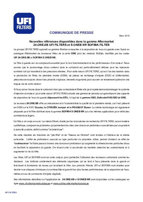 Le groupe UFI FILTERS agrandit sa gamme filtration consacrée à la séparation de l'eau du gazole avec l'ajout au catalogue Aftermarket de nouveaux filtres de la série ONE pour les moteurs Multijet, identifiés par les codes UFI 24.ONE.0B et SOFIMA S ONEB NR.