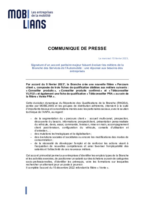 Par accord du 9 février 2023, la Branche crée une nouvelle filière « Parcours client », composée de trois fiches de qualification dédiées aux métiers suivants : « Conseiller produits », « Conseiller produits confirmé » et « Téléconseiller VL/VUI » et également une fiche de qualification « Téléconseiller PRA » au sein de la filière « Vente PRA ».