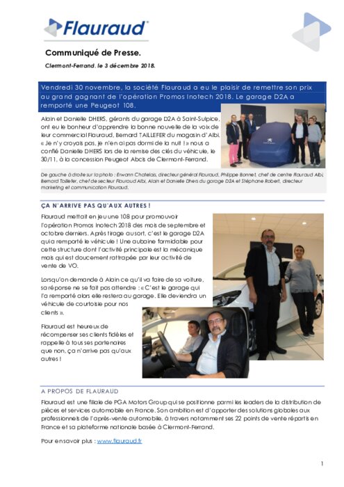 Distributeurs 03 décembre 2018 - 08:58 Vendredi 30 novembre, la société Flauraud a eu le plaisir de remettre son prix au grand gagnant de l’opération Promos Inotech 2018. Le garage D2A a remporté une Peugeot 108. PDF (193 Ko) Télécharger PDF (274 Ko) Télécharger