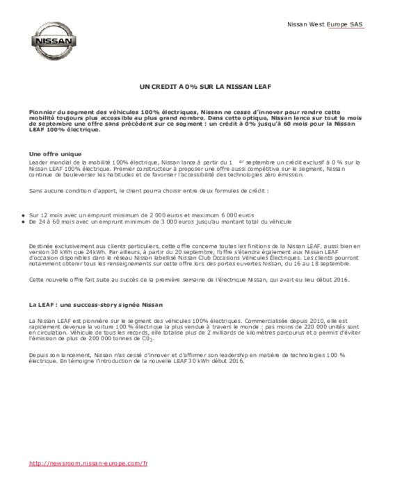 Pionnier du segment des véhicules 100% électriques, Nissan ne cesse d’innover pour rendre cette mobilité toujours plus accessible au plus grand nombre. Dans cette optique, Nissan lance sur tout le mois de septembre une offre sans précédent sur ce segment : un crédit à 0% jusqu’à 60 mois pour la Nissan LEAF 100% électrique.