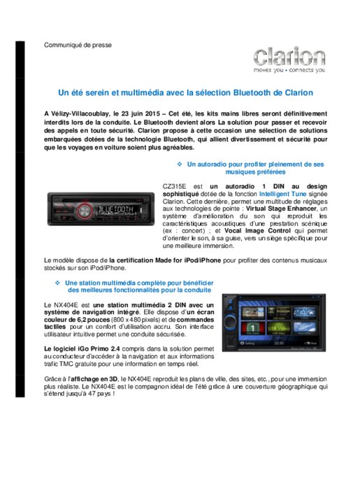 Cet été, les kits mains libres seront définitivement interdits lors de la conduite. Le Bluetooth devient alors La solution pour passer et recevoir des appels en toute sécurité. Clarion propose à cette occasion une sélection de solutions embarquées dotées de la technologie Bluetooth, qui allient divertissement et sécurité pour que les voyages en voiture soient plus agréables.