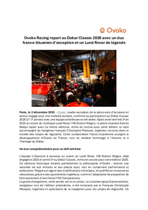 Distributeurs, Equipementiers 04 décembre 2025 - 05:23 Ovoko, spécialiste européen de la seconde main auto, veut démontrer qu’un véhicule vintage optimisé intelligemment peut tenir tête aux machines modernes, sur la course la plus exigeante au monde. PDF (3 Mo) Télécharger credit Ovoko