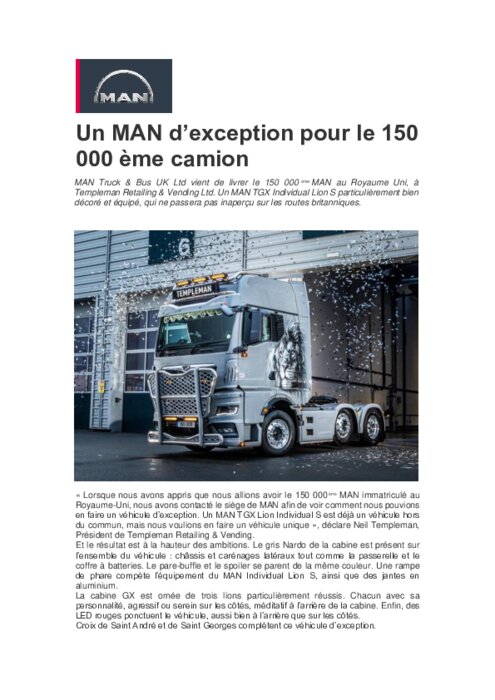 Constructeurs 25 avril 2023 - 10:12 MAN Truck & Bus UK Ltd vient de livrer le 150 000 ème MAN au Royaume Uni, à Templeman Retailing & Vending Ltd. Un MAN TGX Individual Lion S particulièrement bien décoré et équipé, qui ne passera pas inaperçu sur les routes britanniques. PDF (310 Ko) Télécharger