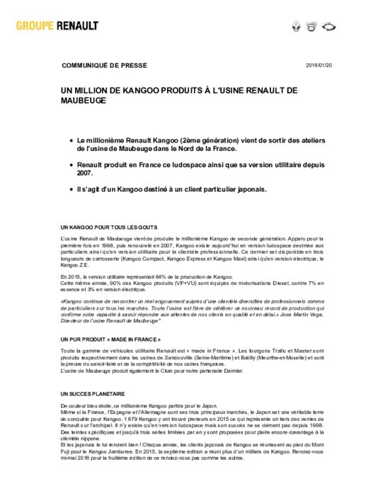 L’usine Renault de Maubeuge vient de produire le millionième Kangoo de seconde génération. Apparu pour la première fois en 1998, puis renouvelé en 2007, Kangoo existe aujourd’hui en version ludospace destinée aux particuliers ainsi qu’en version utilitaire pour la clientèle professionnelle. Ce dernier est disponible en trois longueurs de carrosserie (Kangoo Compact, Kangoo Express et Kangoo Maxi) ainsi qu’en version électrique, le Kangoo Z.E.