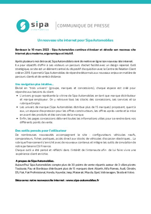 Après plusieurs moi de travail, Sipa Automobiles vient de mettre en ligne son nouveau site internet. Il a pour objectifs d'offrir à ses visiteurs un parcours d'achat facilité avec un design repensé. Outil stratégique, ce site est un élément central du dispositif d'acquisition avec le Centre de Relation Client créé en 2019. Il permet à Sipa Automobiles de répondre désormais aux nouveaux enjeux en matière de parcours clients et de vente à distance.