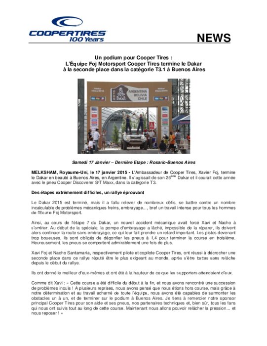 L’Équipe Foj Motorsport Cooper Tires termine le Dakar à la seconde place dans la catégorie T3.1 à Buenos Aires. L’Ambassadeur de Cooper Tires, Xavier Foj, termine le Dakar en beauté à Buenos Aires, en Argentine. Il s’agissait de son 25ème Dakar et il courait cette année avec le pneu Cooper Discoverer S/T Maxx, dans la catégorie T3.