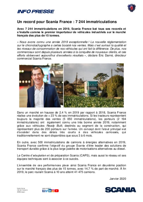 Avec 7 244 immatriculations en 2019, Scania France bat tous ses records et s'installe comme le premier importateur de véhicules industriels sur le marché français des plus de 15 tonnes.