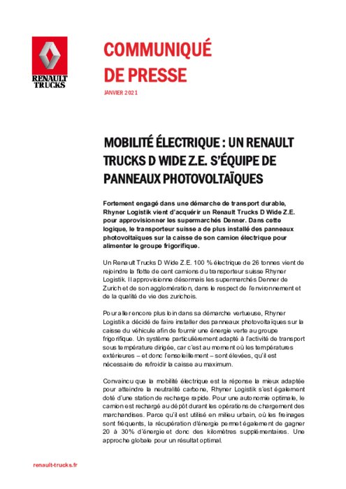 Fortement engagé dans une démarche de transport durable, Rhyner Logistik vient d’acquérir un Renault Trucks D Wide Z.E. pour approvisionner les supermarchés Denner. Dans cette logique, le transporteur suisse a de plus installé des panneaux photovoltaïques sur la caisse de son camion électrique pour alimenter le groupe frigorifique.