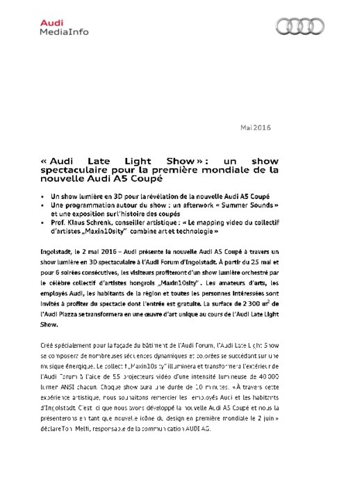 Audi présente la nouvelle Audi A5 Coupé à travers un show lumière en 3D spectaculaire à l’Audi Forum d’Ingolstadt. À partir du 25 mai et pour 6 soirées consécutives, les visiteurs profiteront d’un show lumière orchestré par le célèbre collectif d’artistes hongrois „Maxin10sity” . Les amateurs d’arts, les employés Audi, les habitants de la région et toutes les personnes intéressées sont invités à profiter du spectacle dont l’entrée est gratuite.