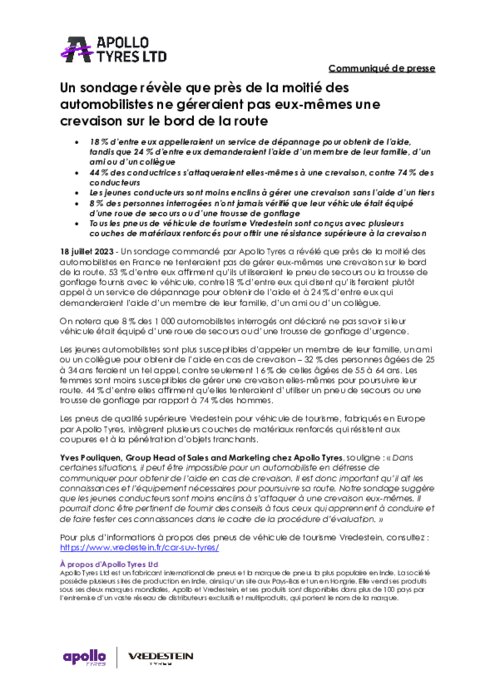 Un sondage commandé par Apollo Tyres a révélé que près de la moitié des automobilistes en France ne tenteraient pas de gérer eux-mêmes une crevaison sur le bord de la route. 53 % d’entre eux affirment qu’ils utiliseraient le pneu de secours ou la trousse de gonflage fournis avec le véhicule, contre 18 % d’entre eux qui disent qu’ils feraient plutôt appel à un service de dépannage pour obtenir de l’aide et à 24 % d’entre eux qui demanderaient l’aide d’un tiers.