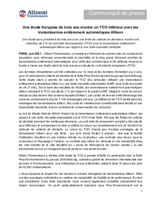 Allison Transmission, concepteur et fabricant de premier plan de solutions de propulsion pour véhicules conventionnels et électrifiés et le plus grand fabricant mondial de transmissions entièrement automatiques pour véhicules commerciaux et de défense moyens et lourds a mené une étude client de trois ans pour calculer le coût total de possession (TCO).