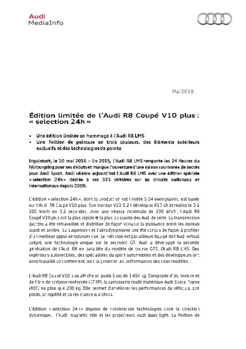 En 2015, l’Audi R8 LMS remporte les 24 Heures du Nürburgring pour ses débuts et marque l’ouverture d’une saison couronnée de succès pour Audi Sport. Audi célèbre aujourd’hui l’Audi R8 LMS avec une édition spéciale « selection 24h » dédiée à ses 323 victoires sur les circuits nationaux et internationaux depuis 2009.