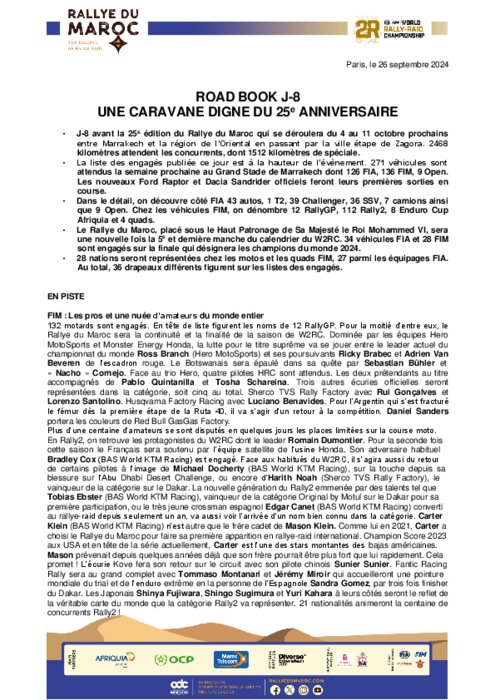 Le Rallye du Maroc, placé sous le Haut Patronage de Sa Majesté le Roi Mohammed VI, sera une nouvelle fois la 5e et dernière manche du calendrier du W2RC. 34 véhicules FIA et 28 FIM sont engagés sur la finale qui désignera les champions du monde 2024.