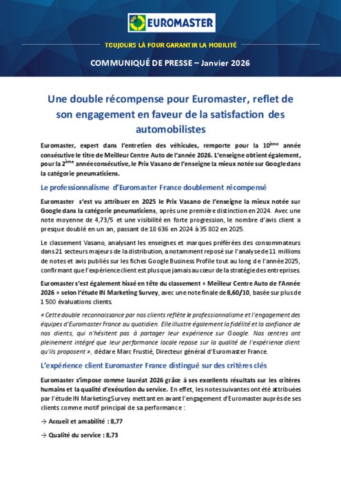 Euromaster, expert dans l’entretien des véhicules, remporte pour la 10ème année consécutive le titre de Meilleur Centre Auto de l’année 2026. L’enseigne obtient également, pour la 2ème année consécutive, le Prix Vasano de l’enseigne la mieux notée sur Google dans la catégorie pneumaticiens.