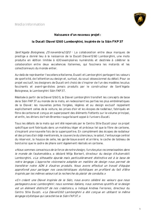 La collaboration entre deux marques de prestige a donné lieu à la naissance de la Ducati Diavel 1260 Lamborghini, une moto produite en édition limitée à 630 exemplaires numérotés et destinée à célébrer la collaboration entre deux excellences italiennes, qui fascinera les motards et les collectionneurs du monde entier.