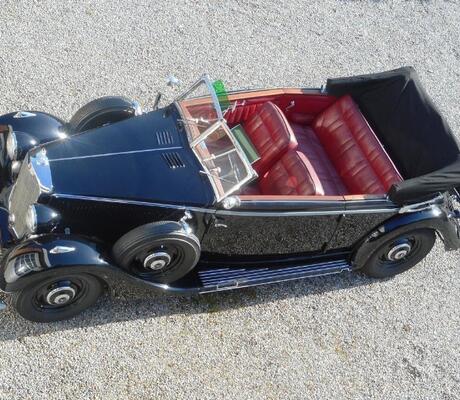 Cette voiture de 1938 est encore plus spéciale puisqu'il s'agit d'une voiture haut de gamme de Mannheim, équipée de tous les détails imaginés par Mercedes. À cette époque, c'était probablement l'une des meilleures voitures au monde. Aujourd'hui, elle en garde le reflet, mais uniquement en raison des milliers d'heures que son propriétaire enthousiaste lui a consacrées. Lauritz Lauritzen avait trouvé cette voiture complètement délabrée dans une grange en 1980, et un expert-mécanicien de chez Mercedes releva le défi de lui rendre sa gloire d'antan. Onze ans plus tard, la voiture était de nouveau en état de marche.