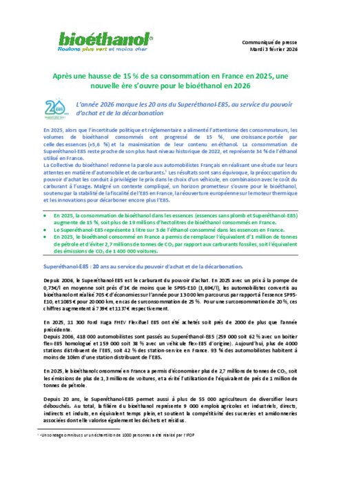 En 2025, alors que l’incertitude politique et réglementaire a alimenté l’attentisme des consommateurs, les volumes de bioéthanol consommés ont progressé de 15 %, une croissance portée par celle des essences (+5,6 %) et la maximisation de leur contenu en éthanol. La consommation de Superéthanol-E85 reste proche de son plus haut niveau historique de 2022, et représente 34 % de l’éthanol utilisé en France. La Collective du bioéthanol redonne la parole aux automobilistes Français en réalisant une étude sur leurs attentes en matière d’automobile et de carburants.