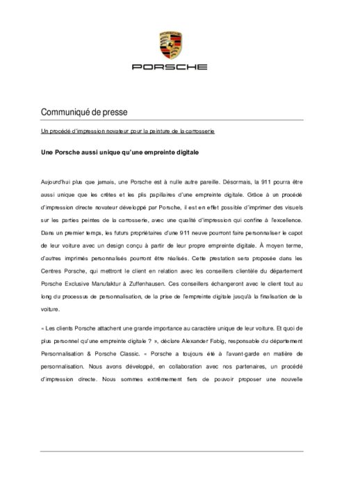 Une Porsche est à nulle autre pareille. Désormais, la 911 pourra être aussi unique que les crêtes et les plis papillaires d’une empreinte digitale. Grâce à un procédé d’impression directe novateur développé par Porsche, il est en effet possible d’imprimer des visuels sur les parties peintes de la carrosserie, avec une qualité d’impression qui confine à l’excellence. Dans un premier temps, les futurs propriétaires d’une 911 neuve pourront faire personnaliser le capot...