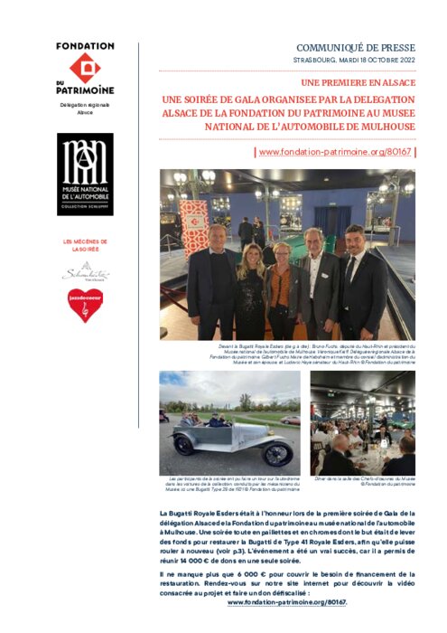 La Bugatti Royale Esders était à l’honneur lors de la première soirée de Gala de la délégation Alsace de la Fondation du patrimoine au musée national de l’automobile à Mulhouse. Une soirée toute en paillettes et en chromes dont le but était de lever des fonds pour restaurer la Bugatti de Type 41 Royale Esders, afin qu’elle puisse rouler à nouveau. L’événement a été un vrai succès, car il a permis de réunir 14 000 € de dons en une seule soirée.