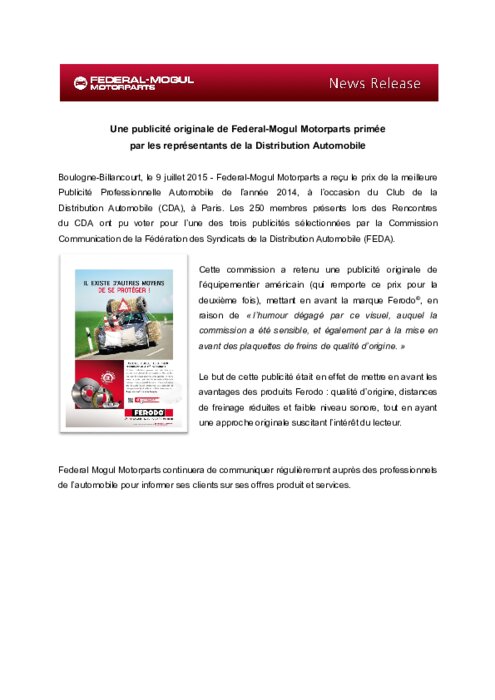 Federal-Mogul Motorparts a reçu le prix de la meilleure Publicité Professionnelle Automobile de l’année 2014, à l’occasion du Club de la Distribution Automobile (CDA), à Paris. Les 250 membres présents lors des Rencontres du CDA ont pu voter pour l’une des trois publicités sélectionnées par la Commission Communication de la Fédération des Syndicats de la Distribution Automobile (FEDA).