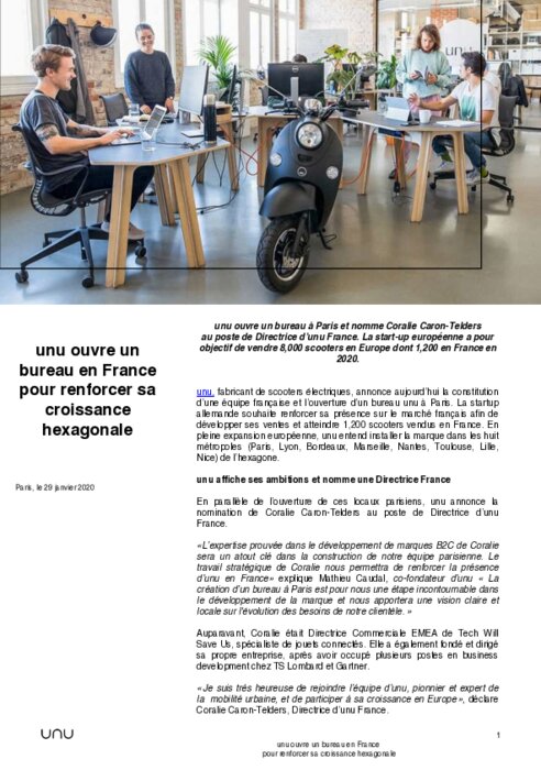unu, fabricant de scooters électriques, annonce la constitution d'une équipe française et l'ouverture d'un bureau unu à Paris. La startup allemande souhaite renforcer sa présence sur le marché français afin de développer ses ventes et atteindre 1,200 scooters vendus en France. En pleine expansion européenne, unu entend installer la marque dans les huit métropoles (Paris, Lyon, Bordeaux, Marseille, Nantes, Toulouse, Lille, Nice) de l'hexagone.