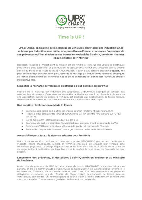 UP&CHARGE, spécialiste de la recharge de véhicules électriques par induction lance sa borne par induction sans câble, une première en France, et annonce l’ouverture de ses préventes et l’installation de ses bornes en exclusivité à Saint-Quentin en Yvelines et au Ministère de l’Intérieur.