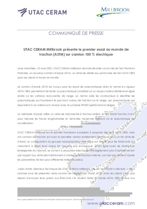 UTAC CERAM Millbrook vient de dévoiler sur son site de Test World en Finlande, un nouveau véhicule d'essais ASTM. Il est conçu pour les essais de pneumatiques selon la norme en vigueur ASTM 1805, permettant de tester un pneumatique candidat sur un moyeu moteur dédié et en ligne droite sur les surfaces recouvertes de neige...