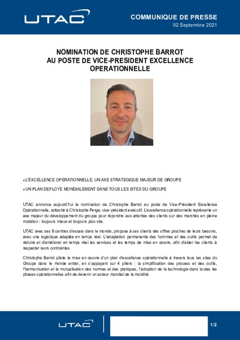 UTAC annonce la nomination de Christophe Barrot au poste de Vice-Président Excellence Opérationnelle, rattaché à Christophe Perge, vice-président exécutif. L’excellence opérationnelle représente un axe majeur du développement du groupe pour répondre aux attentes des clients sur des marchés en pleine mutation : toujours mieux et toujours plus vite.