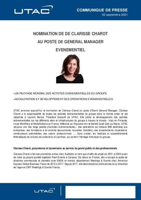 UTAC annonce aujourd’hui la nomination de Clarisse Charot au poste d’Event General Manager. Clarisse Charot a la responsabilité de toutes les activités événementielles du groupe dans le monde entier et est rattachée à Laurent Benoit, Président Exécutif de UTAC. Elle pilote le développement des activités événementielles sur les différents sites et infrastructures du groupe à travers le monde : Ivalo en Finlande, Linas-Montlhéry et Mortefontaine en France, Millbrook au Royaume-Uni...