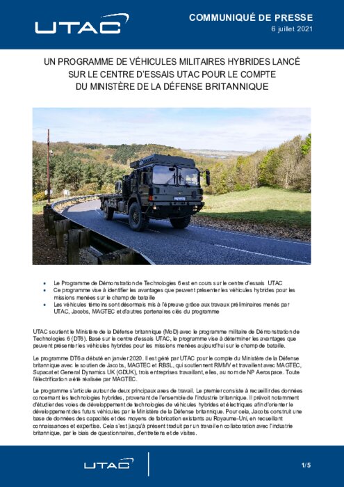 UTAC soutient le Ministère de la Défense britannique (MoD) avec le programme militaire de Démonstration de Technologies 6 (DT6). Basé sur le centre d’essais UTAC, le programme vise à déterminer les avantages que peuvent présenter les véhicules hybrides pour les missions menées aujourd’hui sur le champ de bataille. Le programme DT6 a débuté en janvier 2020. Il est géré par UTAC pour le compte du Ministère de la Défense britannique avec le soutien de Jacobs, MAGTEC et RBSL...