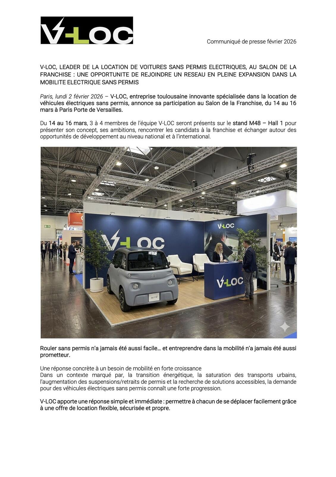 Services 02 février 2026 - 16:51 V-LOC, entreprise toulousaine innovante spécialisée dans la location de véhicules électriques sans permis, annonce sa participation au Salon de la Franchise, du 14 au 16 mars à Paris Porte de Versailles. PDF (4 Mo) Télécharger credit V loc