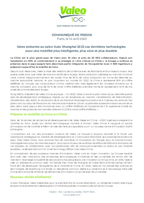Equipementiers 14 avril 2023 - 09:30 A Auto Shanghai, Valeo présentera pour la première fois le nouvel eDeliver4U, un droïde de livraison électrique et autonome entièrement développé en Chine et équipé des innovations de pointe du Groupe. PDF (860 Ko) Télécharger