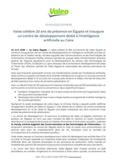 Valeo célèbre le 20e anniversaire de Valeo Égypte et annonce l'inauguration de son centre de développement en intelligence artificielle au Caire, en présence de M. Raafat Hendy, ministre égyptien des Communications et des Technologies de l'information, Christophe Périllat, directeur général du groupe Valeo, Ahmed Elzaher, directeur général de l'Agence égyptienne pour le développement du secteur des technologies de l'information (ITIDA), Christophe Le Ligné, directeur de la recherche et développement de Valeo et Tamer Aly, directeur général de Valeo Égypte et responsable des centres techniques du Groupe.
