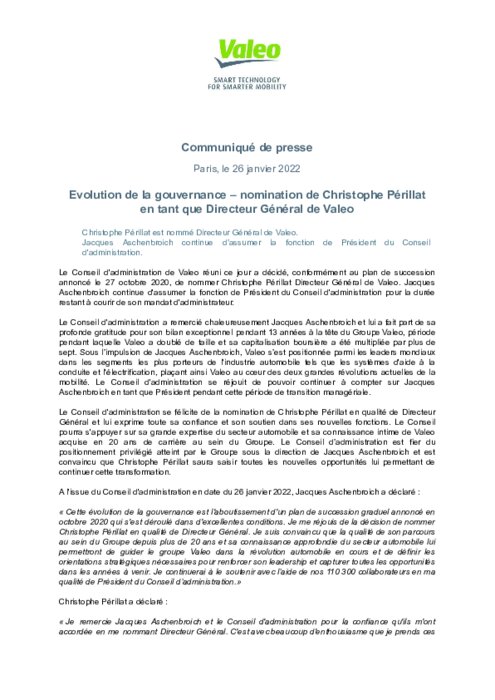 M. Aschenbroich, 67 ans, qui dirigeait le groupe depuis 2009, garde la présidence du groupe jusqu'en mai 2023, dans le cadre d'une succession annoncée fin 2020, précise Valeo dans un communiqué. Christophe Périllat, 56 ans, directeur des opérations de Valeo depuis 2011, prend la tête du dixième équipementier mondial, qui emploie 110.000 salariés.