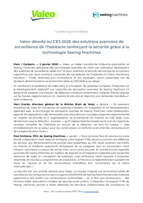 Valeo, un leader mondial de l'industrie automobile, et Seeing Machines, spécialiste des technologies avancées de vision par ordinateur développant des systèmes de surveillance basés sur l’IA pour améliorer la sécurité des transports, annoncent aujourd’hui que leurs solutions conjointes de surveillance de l’habitacle (In-Cabin Monitoring Solutions – ICMS), destinées aux conducteurs et aux passagers, seront présentées lors de plusieurs démonstrations sur le stand de Valeo au CES 2026 à Las Vegas.