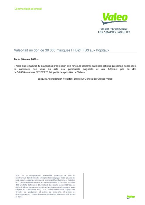 "Alors que le COVID-19 poursuit sa progression en France, la solidarité nationale est plus que jamais nécessaire. Je considère que venir en aide aux personnels soignants et aux hôpitaux par ce don de 30 000 masques FFP2/FFP3 fait partie des priorités de Valeo". (Jacques Aschenbroich, Président-Directeur Général du Groupe Valeo)