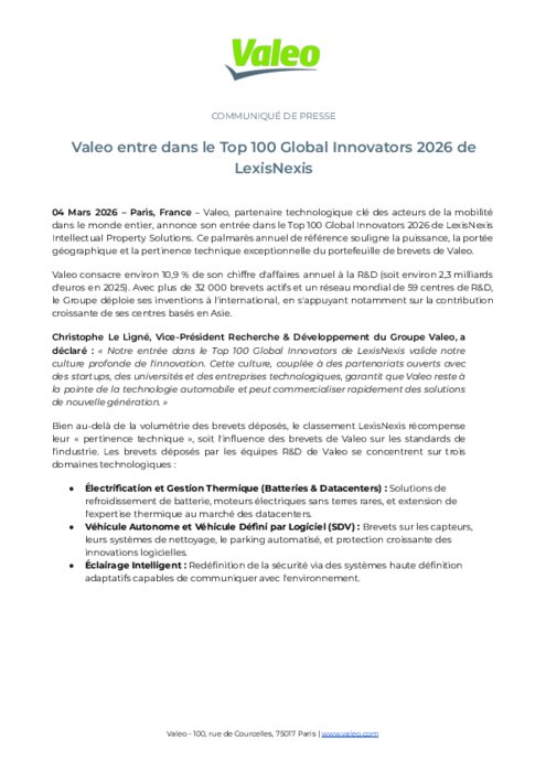 Valeo, partenaire technologique clé des acteurs de la mobilité dans le monde entier, annonce son entrée dans le Top 100 Global Innovators 2026 de LexisNexis Intellectual Property Solutions. Ce palmarès annuel de référence souligne la puissance, la portée géographique et la pertinence technique exceptionnelle du portefeuille de brevets de Valeo.
