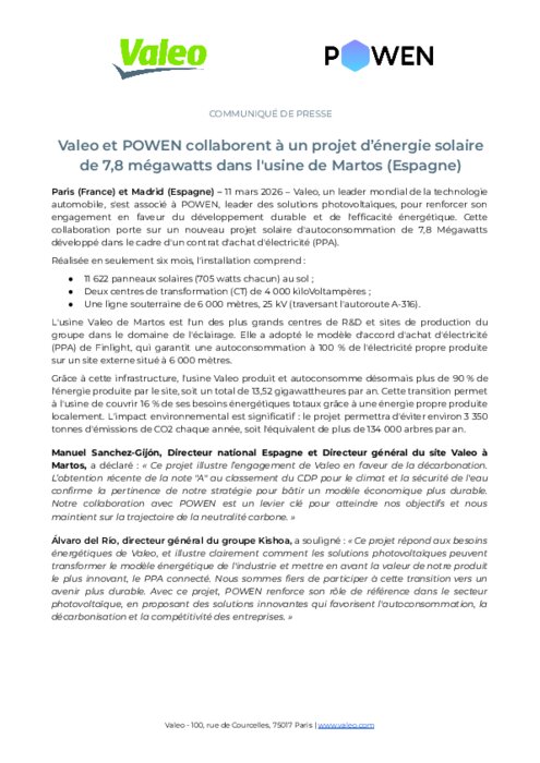 Valeo, un leader mondial de la technologie automobile, s'est associé à Powen, leader des solutions photovoltaïques, pour renforcer son engagement en faveur du développement durable et de l'efficacité énergétique. Cette collaboration porte sur un nouveau projet solaire d'autoconsommation de 7,8 Mégawatts développé dans le cadre d'un contrat d'achat d'électricité (PPA).