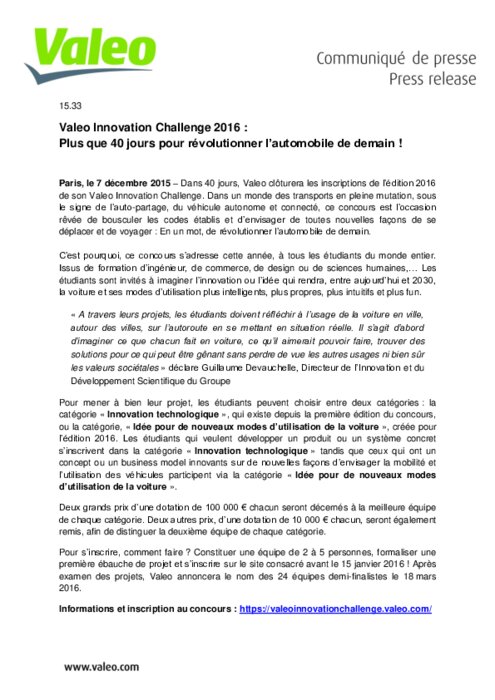 Dans 40 jours, Valeo clôturera les inscriptions de l’édition 2016 de son Valeo Innovation Challenge. Dans un monde des transports en pleine mutation, sous le signe de l’auto-partage, du véhicule autonome et connecté, ce concours est l’occasion rêvée de bousculer les codes établis et d’envisager de toutes nouvelles façons de se déplacer et de voyager : En un mot, de révolutionner l’automobile de demain.
