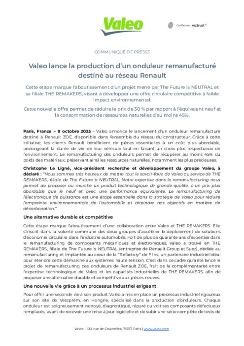 Valeo annonce le lancement d'un onduleur remanufacturé destiné à Renault ZOE, disponible dans l’ensemble du réseau du constructeur. Grâce à cette initiative, les clients Renault bénéficient de pièces essentielles à un coût plus abordable, prolongeant la durée de vie de leur véhicule tout en faisant un choix plus respectueux de l’environnement. Le remanufacturing des onduleurs permet de récupérer au moins 45% du poids des matériaux, préservant ainsi les ressources naturelles, notamment les plus précieuses.