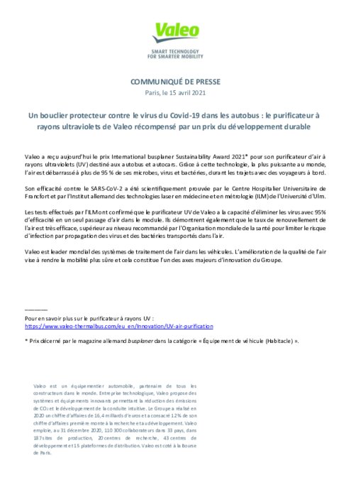 Valeo a reçu aujourd’hui le prix International busplaner Sustainability Award 2021 pour son purificateur d’air à rayons ultraviolets (UV) destiné aux autobus et autocars. Grâce à cette technologie, la plus puissante au monde, l’air est débarrassé à plus de 95 % de ses microbes, virus et bactéries, durant les trajets avec des voyageurs à bord.