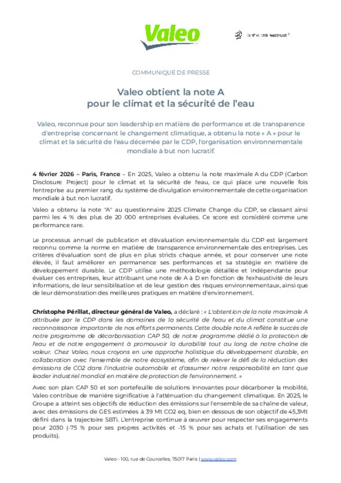 En 2025, Valeo a obtenu la note maximale A du CDP (Carbon Disclosure Project) pour le climat et la sécurité de l'eau, ce qui place une nouvelle fois l'entreprise au premier rang du système de divulgation environnementale de cette organisation mondiale à but non lucratif.